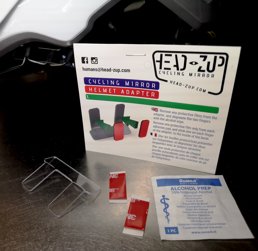 El adaptador Head-Zup permite sujetar el espejo directamente a un casco en lugar de a los anteojos, para aquellos que no usan anteojos o prefieren usar el espejo en el casco.